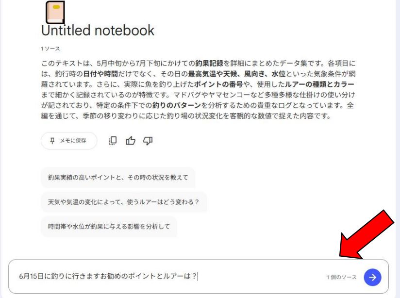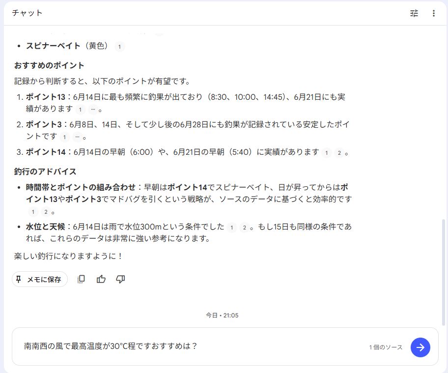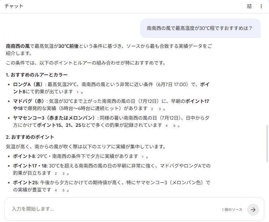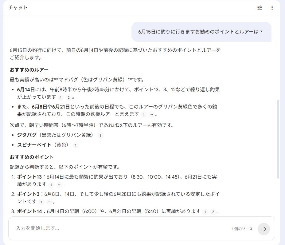 下の画面は今回ご紹介する方法で作成したAIに「釣りに行く日付とお勧めポイントとルアー」を聞いてみた結果です。
