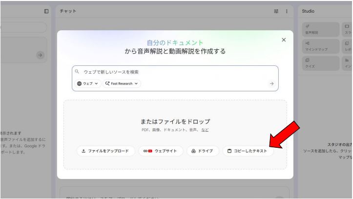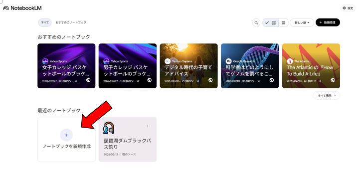 1.NotebookLMのホームページにある、「ノートブックを新規作成」をクリックします。