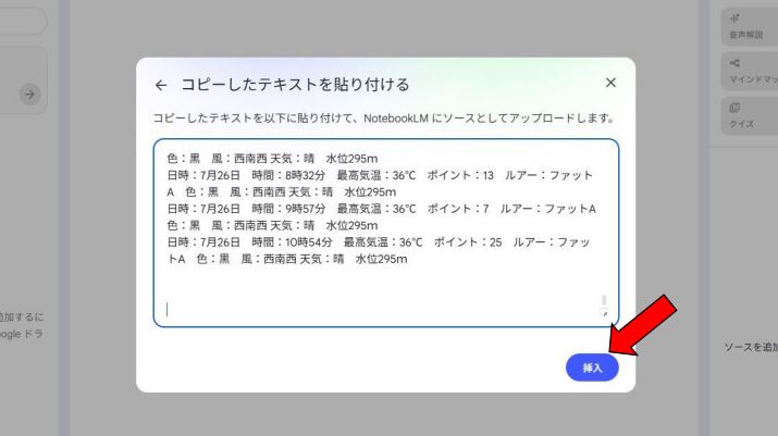 3.枠内に先ほど作成した釣果データをコピーして貼り付けます。
