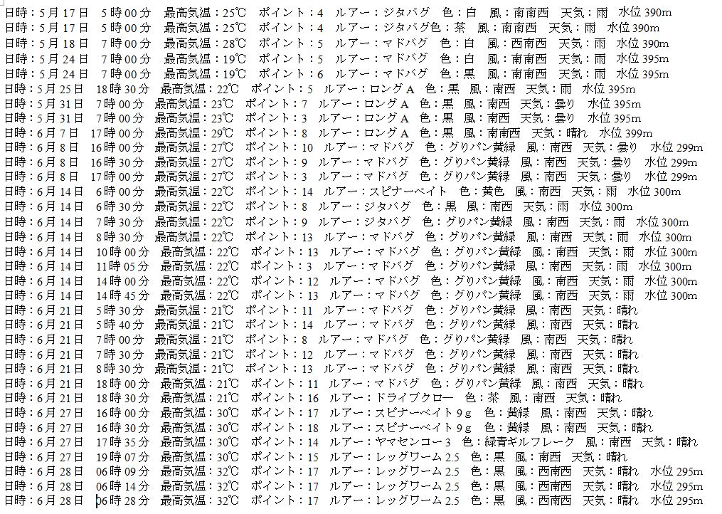 日時 / 最高気温 / ポイント(地図の番号) / ルアー種類 / 色 / 風向 / 天候 / ダムの水位