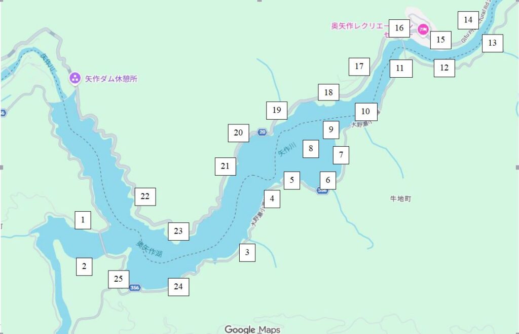 矢作ダムのマップ上の釣りポイントに数字を書き入れていきます。